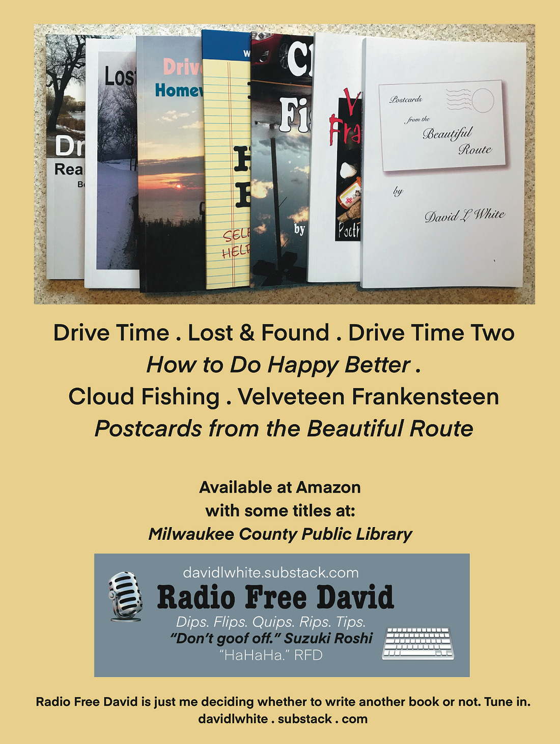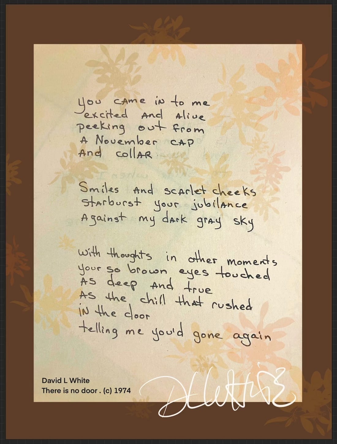 … This ‘excited and alive’ poem, to a Miss Julie Petullo, was the first and last time I ever sent any work out to publishers. Ever. It placed 28th out of 5000+ entries in the Judson Jerome Poet Corner contest in the Writers Magazine in 1972, or ‘73. I self-published it in ‘74. The party continues. And, lest I forget to mention, in 2024, and in honor of my 50th self-publishing anniversary, I created a coloring book, for my 90 year old mother, featuring my own hand-drawn scritchy doodles. That can be found with my other Amazon books at the link: https://www.amazon.com/author/davidlwhite My first book was set in my own hand; a grapho-analysts puzzle book. The coloring-book outline doodles are also hand drawn. The bonus of the most recent hand done master was a minor epiphany into the expanded ideas of trash. The additional images indicate the EverAfterParty. Amazon books by David L White: on Amazon. Click it. Amazon books by David L White: on Amazon. Click it. Thank you for visiting. Take some time for your self. |